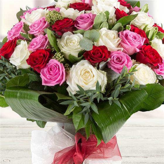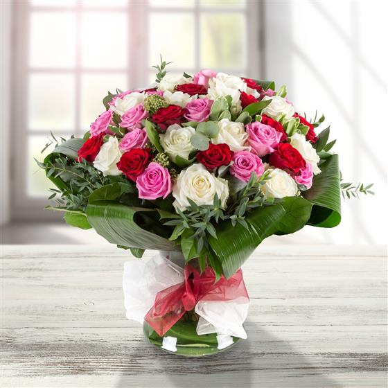 A show stopping hand-tied bouquet of 36 closely bound roses in pink, red and white. Vase not included.